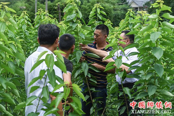 7月2日,农技专家与桃源溪村的党员查看车厘子苗的长势。