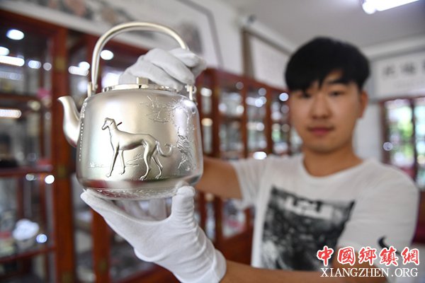 7月11日,河北省遵化市马兰峪镇一家金银器加工企业的工人在展示银质工艺品。