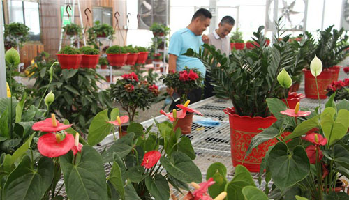 7月26日,石庙镇青阳店村民陈亮(左)在惠民县骏茂花卉公司基地内向访客介绍花卉。 今年以来,山东省惠民县石庙镇打造“花卉石庙 康养小镇”品牌,将花卉产业作为主打,走出一条既符合环保要求,又带动村民致富的路子。近年来,随着生态环保发展理念的推行,山东省惠民县逐步淘汰落后污染产能,发展绿色、高效新产业,“一镇一业、一村一品”格局初步形成,高效生态农业实现提质增效。 新华社记者 邵琨 摄