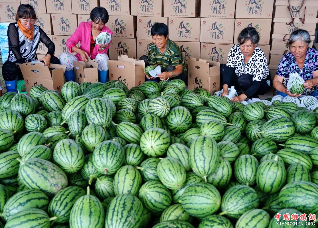 7月25日,张家口市宣化区塔儿村乡西庄子村扶贫“牛奶西瓜”种植合作社的社员在将西瓜装箱,准备销售。