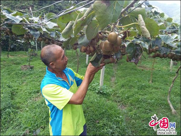 中国网8月15讯 8月14日,湖南绥宁长铺子苗族侗族乡佘家村村民秦德彬在自己的猕猴桃地里除草,望着密密匝匝挂满技头的猕猴桃,他感慨万端。过去,他靠采摘野生的猕猴桃赚点小钱,而今他三年前栽培的红心猕猴桃3亩地已经全部挂果,去年他摘了600多斤,收入6000多元,今年预计每亩能产2000多斤,收入可突破6万元。秦德彬像喝了蜜一样,心里乐开了花。