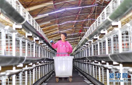 8月29日,在山东省淄博市沂源县大张庄镇南岩四村,工人在养殖车间分投饲料。 近年来,山东省沂源县大力发展车间化畜禽生态养殖生产,建立高标准的自动化养殖车间,以规模化、现代化、生态化和粪便集中循环处理的养殖方式替代传统的养殖模式,推动畜禽绿色养殖。 新华社发(赵东山 摄)
