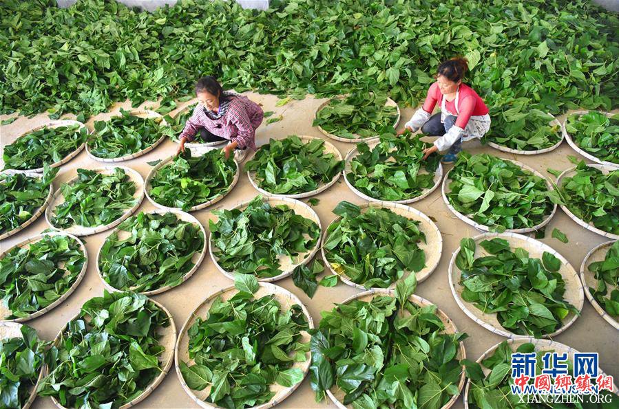 9月9日,在山东省淄博市沂源县鲁村镇南官庄村金霖蚕茧养殖合作社,两名工人在分装桑叶准备为蚕宝宝喂食。