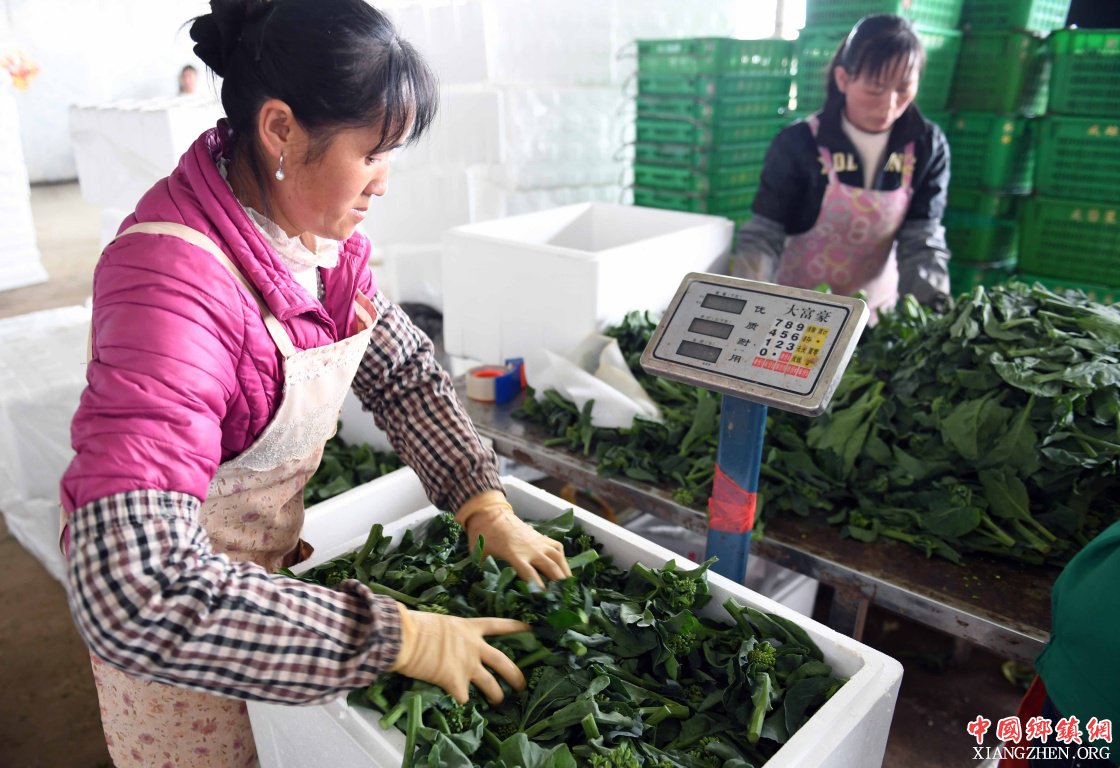 9月8日,在曲靖市沾益区花山街道施家屯社区,村民在包装出口外销的蔬菜。