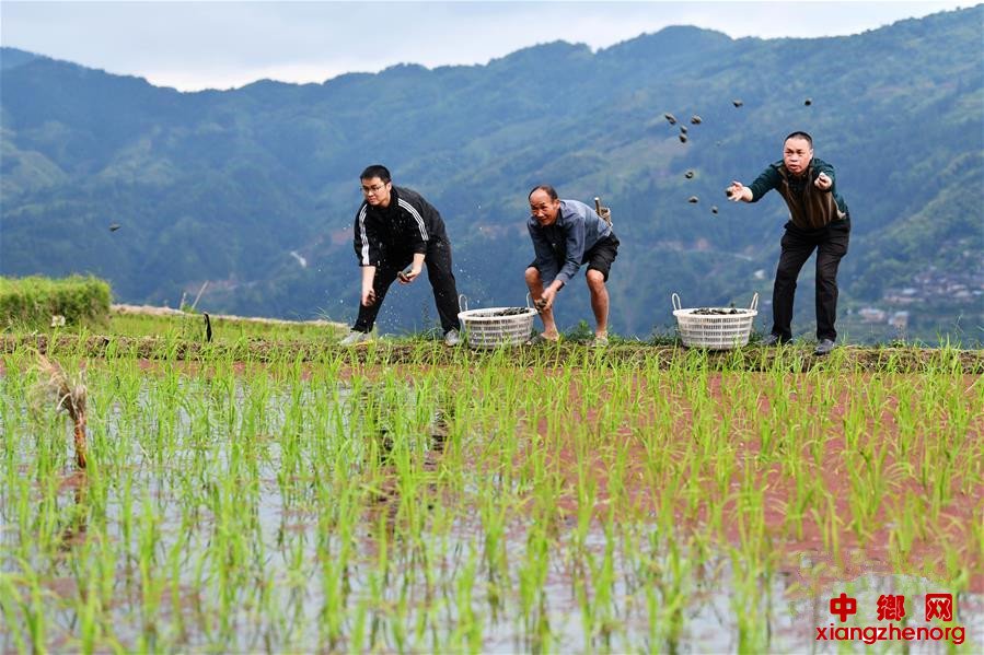 5月26日,贵州省黔东南州住建局派驻从江县加榜乡加车村的帮扶干部(左一、右一)帮助村民一起播撒种螺。新华社记者 杨文斌 摄