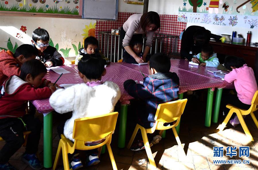 在门源县东川镇尕牧龙上村的幼儿园内,老师在指导孩子们写字(10月25日摄)。