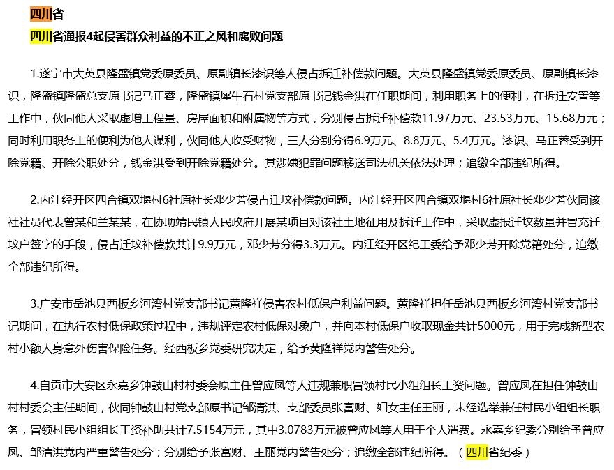 1.遂宁市大英县隆盛镇党委原委员、原副镇长漆识等人侵占拆迁补偿款问题。大英县隆盛镇党委原委员、原副镇长漆识,隆盛镇隆盛总支原书记马正蓉,隆盛镇犀牛石村党支部原书记钱金洪在任职期间,利用职务上的便利,在拆迁安置等工作中,伙同他人采取虚增工程量、房屋面积和附属物等方式,分别侵占拆迁补偿款11.97万元、23.53万元、15.68万元;同时利用职务上的便利为他人谋利,伙同他人收受财物,三人分别分得6.9万元、8.8万元、5.4万元。漆识、马正蓉受到开除党籍、开除公职处分,钱金洪受到开除党籍处分。其涉嫌犯罪问题移送司法机关依法处理;追缴全部违纪所得。