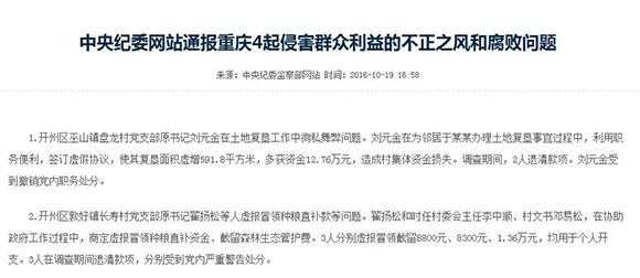 中纪委通报了重庆4起侵害群众利益不正之风和腐败问题。网站截图
