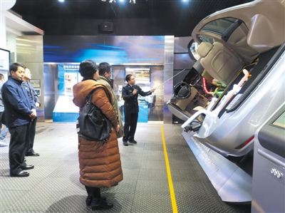 昨日,市人大代表视察北京市机动车排放管理中心,听工作人员讲解汽车减排原理。新京报记者 王贵彬 摄
