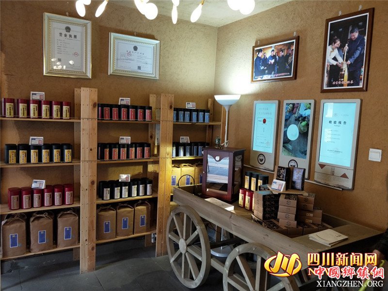 “茶祥子”制茶坊展示厅内摆放着当地产的黑茶,墙上挂着总书记视察照片。