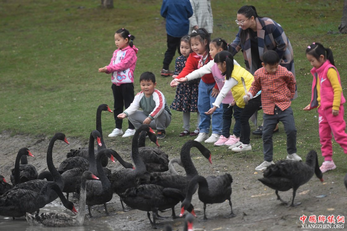 11月14日,湖州市吴兴区八里店农民社区的小朋友在公园给黑天鹅喂食。