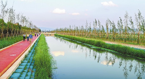近日,游人正在于今年1月完工的杞麓湖沿湖截污治污工程生态调蓄带上休闲散步、观赏沿湖美景。该工程完成投资5095.54万元,是杞麓湖保护治理的重要项目之一,主要对沿岸农田废水、污水处理厂尾水进行截流和处理后回灌农田,可大大减少农田化肥、农药和植物残渣等污染物进入杞麓湖。(记者 曾永洪 摄)