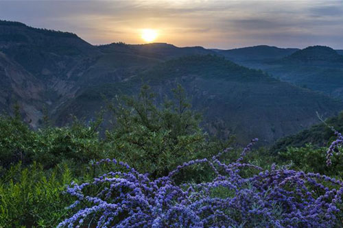 在陕西省吴起县马湾村,醉鱼草花绽放,如紫色的云彩覆盖在绵延起伏的山峁上(6月7日摄)。 新华社记者陶明摄
