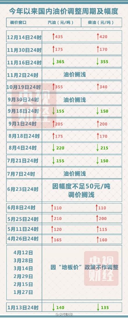 【14日24点涨油价!加满一箱汽油将多花17元】 14日24时,国内油价迎年内第9次上调:汽油每吨上调435元,柴油每吨上调420元。折合每升90号汽油每升上调0.32元,92号汽油每升上调0.34元,95号每升上调0.36元,0号柴油每升上调0.36元。一般家用汽车油箱50L,加满一箱92号汽油将多花17元。 责任编辑:陈雪梅
