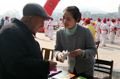 图为:1月3日,福建浦城县供电公司员工在莲塘镇摆摊设点为百姓宣传安全用电知识。