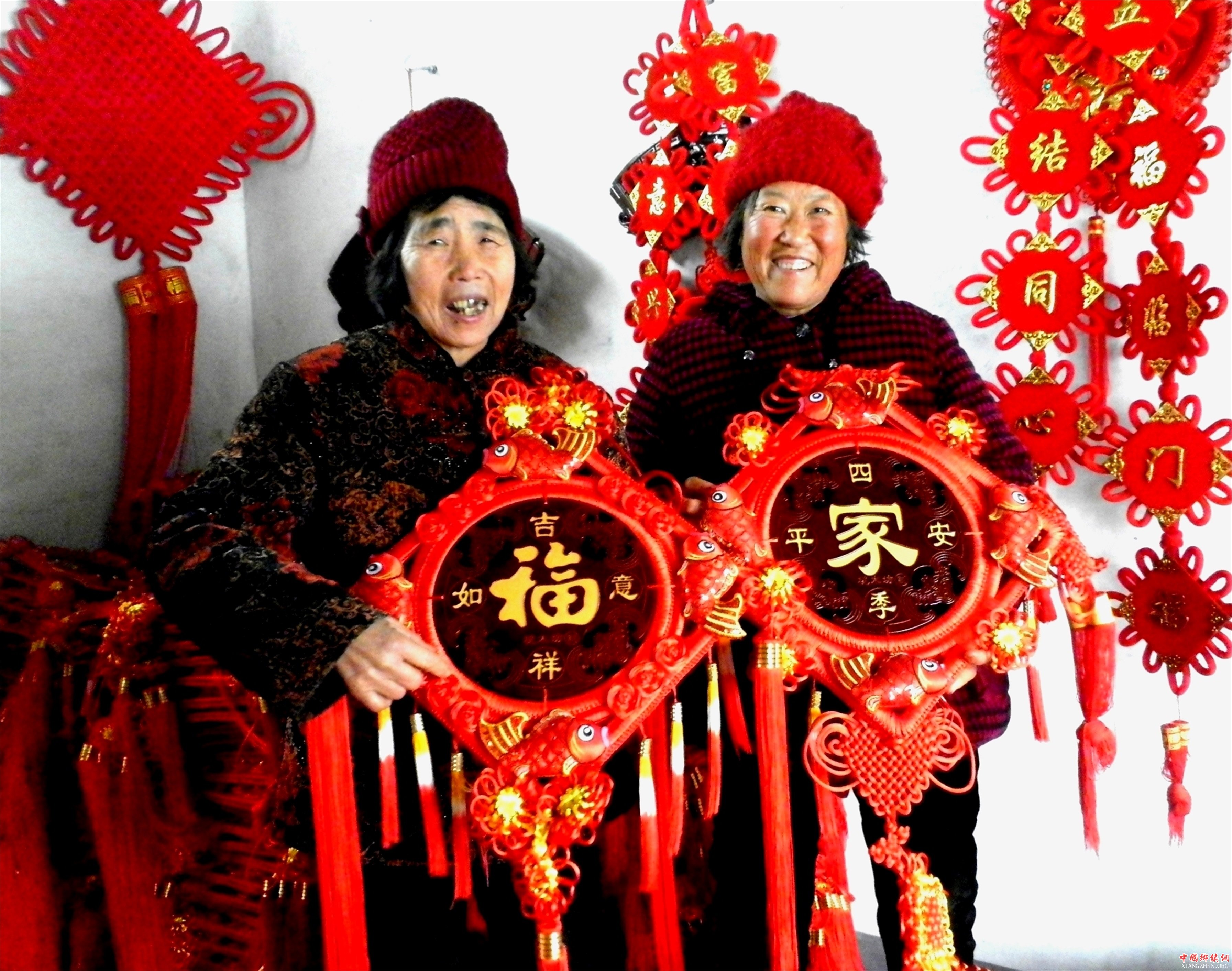 (中国乡镇网讯)瞧,这两位手持“吉祥如意福”、“四季平安家”的老年农村妇女笑的多开心。日前,记者拍下了这一瞬间。她们分别是山东省郯城县马头镇马南社区前赵村的两个返贫户,一个叫张乐芹,一个叫贺庆芝。在本村小伙子陈都军的照顾下,来到“中国红1949”网店打工,一天最少挣60元钱,解决了生活根本问题。春节前后,小伙子陈都军的“中国红1949”网店生意异常火爆,每天忙绿发货在六七百单上,经营的上百个品种的“中国结”畅销大中小城市,销售额高达上万元,率先走上了电商经济发展的新路子。(高军 摄影)
