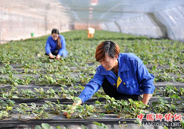 1月11日,农民在河北青县广旺农业专业合作社大棚内管理种植的草莓。