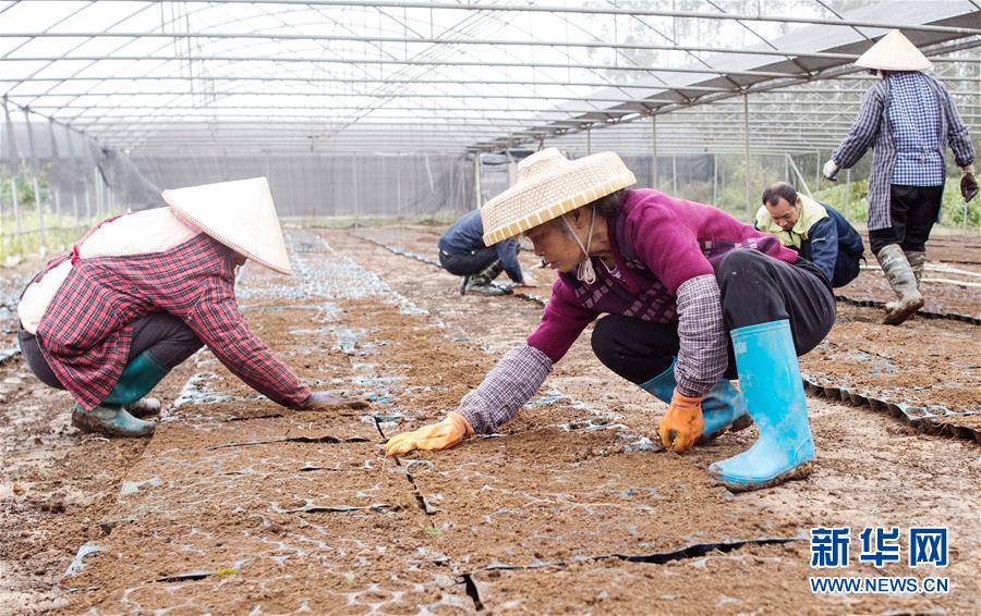 在钦州市钦北区那蒙镇竹山村,农民铺设竹苗育床(1月6日摄)。
