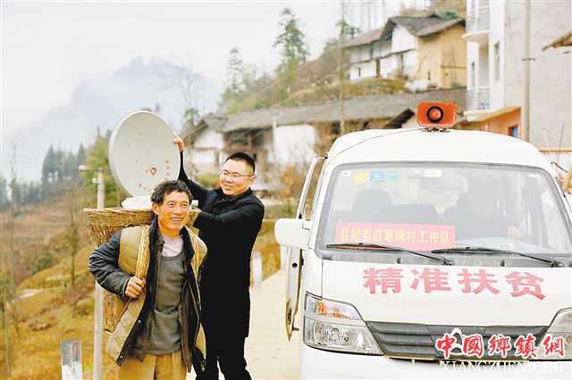 二月十二日,陈洪森(右一)和同事驾驶扶贫专车,为村民们送来了“户户通”卫星接收器。通讯员 谢道玖 摄