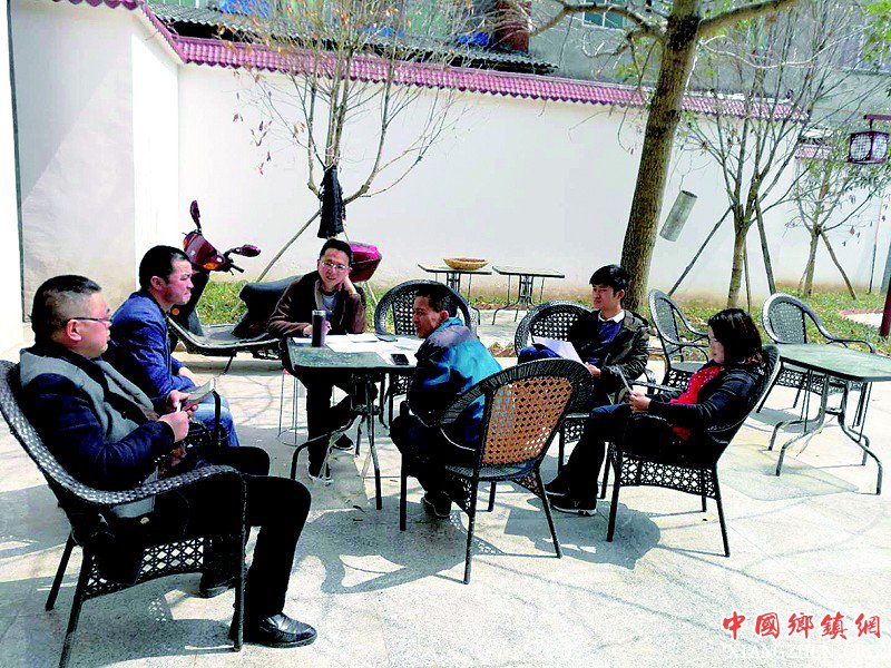 阆中市文旅广局副局长冯文祥(左三)在大树垭村召开扶贫座谈会
