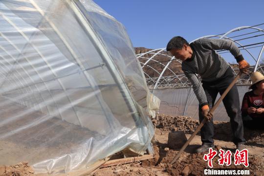 中新网兰州3月18日电 (盘小美)“前两天刚把大棚修好,今天就来上肥平地,今年打算种6座大棚甜瓜。”毛军郎边忙活边说,现在瓜苗已经长出来了,赶清明节之前就能移栽。18日,在的瓜菜基地里,53岁的甘肃庆阳市西峰区显胜乡蒲河村村民毛军郎正在大棚里平整土地。