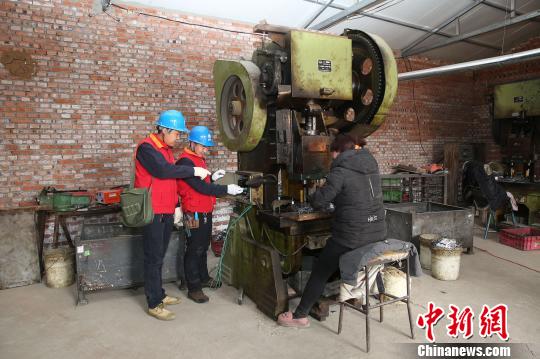 供电所员工为村民陈广志的汽车配件代料加工厂检查用电设备。 孙婷婷 摄