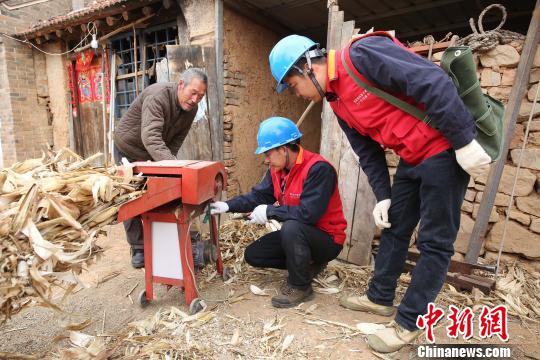 供电所员工为五保户刘国栋家修理铡草机。 孙婷婷 摄