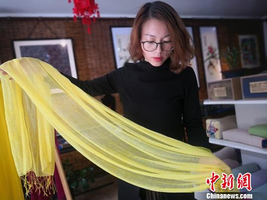 图为祁辉展示手工染织的丝巾。 魏建军 摄
