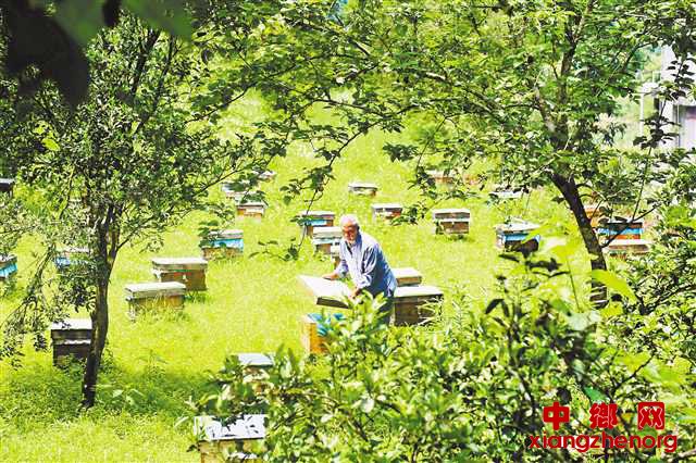 花丛中,蜜蜂“嗡嗡嗡”地忙个不停;林荫下,一位头发花白的老人,正在巡查蜂箱。