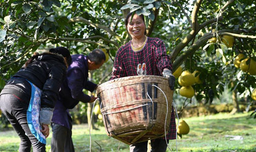 12月5日,四川合江县真龙镇瓦房村村民在收获真龙柚。 近期,四川省泸州市合江县迎来真龙柚丰收,全县30.8万亩真龙柚总产量预计达8500万公斤,较去年增长约三分之一。为推动脱贫攻坚,近年来合江县大力发展真龙柚种植产业,促进当地农民增收致富。 新华社记者 谢佼 摄
