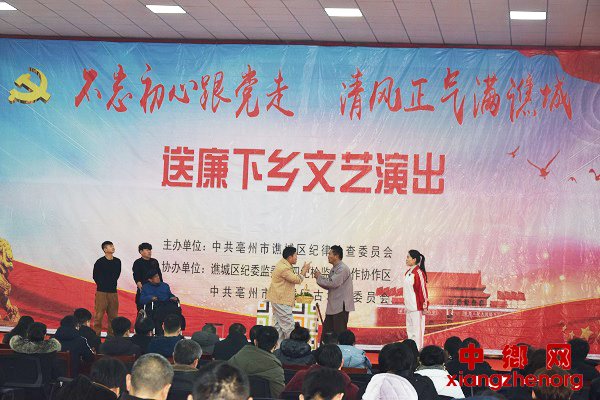 本次演出由谯城区纪委、古城镇政府主办,以“不忘初心跟党走 清风正气满谯城”为主题,节目异彩纷呈,有歌曲《亳州老街》、音舞快板《从严治党得民心》、朗诵诗《宪法在我心中》、扫黑小品《赶集》、小戏曲《套路贷》、歌伴舞《映山红》、小品《蛀虫覆灭记》等,博得观众阵阵掌声。 在春节来临之际,演出寓教于乐,既使广大干部享受一场视觉盛宴,又让大家受到一场廉政教育。来自古城镇、龙扬镇、立德镇、淝河镇的纪委班子成员、44个村纪检员、古城镇全体镇干部和后杨等村全体干部观看了演出。(特约通讯员:王立杰)