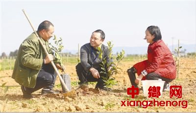 2月28日,四川省蒲江县体泉村驻村第一书记杨议(中)在地里指导村民种植柑橘。