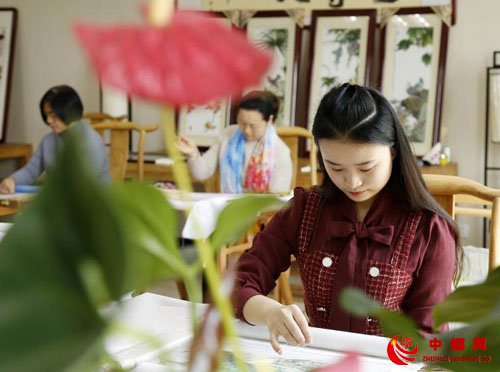 11月15日,邢台市襄都区巾帼职业技能公益培训班的学员在学习刺绣。近年来,河北省邢台市襄都区妇联把发展妇女手工艺作为服务妇女就业、帮助妇女脱贫致富的途径,举办各类职业技能公益培训,促进城乡妇女就近就业、灵活就业。新华社发(张驰 摄)