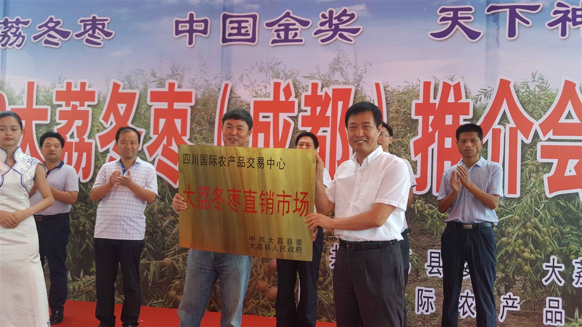 当日,2016陕西大荔冬枣(成都)推介会在濛阳举行,大荔县副县长张峰率团“站台吆喝”,并向四川国际农产品交易中心授予“大荔冬枣直销市场”牌,标志着大荔冬枣正式“落户”成都。这也是大荔继在杭州、广州、沈阳推介会后,首次登陆蓉城,开启拓展西南市场之路。