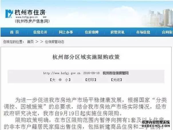 18日,杭州市住房保障和房产管理局公布了《杭州部分区域实施限购政策》,宣布自9月19日起实施住房限购。限购政策明确,在市区限购范围内暂停向拥有1套及以上住房的非本市户籍居民家庭出售住房,包括新建商品住房和二手住房。限购范围为上城区、下城区、江干区、拱墅区、西湖区、杭州高新开发区(滨江)、杭州经济技术开发区、杭州之江国家旅游度假区、萧山区、余杭区,不包含富阳区、大江东以及临安、桐庐、建德、淳安四县(市)。限购时间明确,新建商品住房以网签平台商品房买卖合同签订时间为准;二手住房以网签平台房屋转让合同签订时间为准。