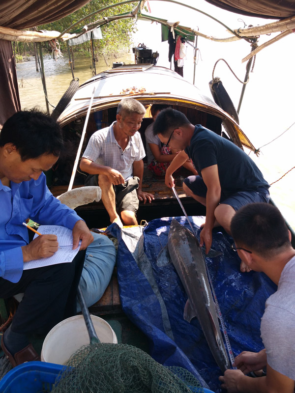 在现场,吴金明和同事们除了鉴定捕捞到鲟鱼的种类,还对部分捕捞到的逃逸鲟鱼解剖,记录其进食情况、性腺发育情况。