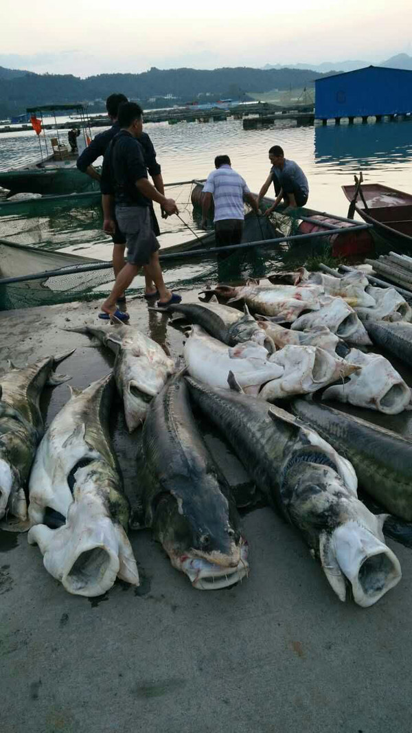 湖北清江受灾养殖户捞出的已死亡达乌尔鳇或达乌尔鳇的杂交种(自然分布在黑龙江地区)。受灾养殖户供图
