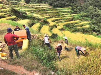 曾小峰利用海拔700米高的古梯田种植有机稻,图为古梯田收割时的场景。
