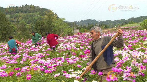66岁的周殿生是元兴乡西阁村村民,有四级残疾。阳光明媚的上午,芍药花开得正艳,老周拿着锄头和村民一起在芍药地里锄草。