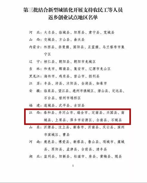 经统计,全国共有135个县(市、区)入选。其中,江西泰和县、井冈山市、瑞金市、定南县、兴国县、南城县、上栗县、萍乡市安源区、全南县、石城县榜上有名!请看详细名单↓↓