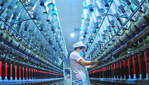1月18日,江苏省连云港市海州区一家纺织企业工人在生产线上工作。