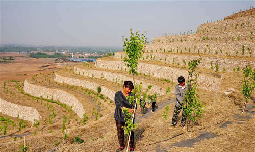 5月6日,滦县鸡冠山生态产业园的工人在梯田里管理梨树。从2015年起,河北唐山友顺农业开发发展有限公司对滦县九百户镇鸡冠山区域的2.5万亩荒山荒坡进行生态恢复、综合开发。经过3年多努力,生态治理8000亩荒山荒坡,修整高标准梯田2000亩,种植果树8.5万棵,昔日杂草丛生的荒山变成一座集有机蔬菜果品种植、特色养殖、生态恢复和观光旅游为一体,以有机农业、创意农业、工程农业和循环农业为特色的山区综合开发示范区。新华社记者 杨世尧 摄