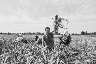 图为山东金乡县蒜农在收获大蒜。