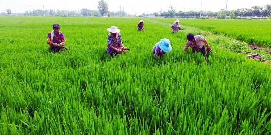眼下正是水稻营养生长期,淮安市淮安区农民抢抓农时,除草施肥,为秋季丰收打好基础。图为车桥镇村民在进行田间管理。刘蕾 摄