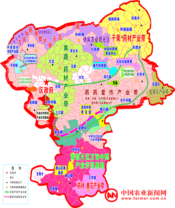 巴州区出台《关于加快巴药产业发展的意见》,制定巴药发展优惠政策,通过“走出去、引进来”等方式,引进秦巴中药、四川毅力集团等龙头企业示范带动农户种植,发展巴药加工、销售。组建国有企业巴中秦岭药业有限公司,创新“龙头企业+基地+专合社”等模式,通过“订单种植、保底价收购”方式,建立企业与专合社、农户的种苗供应和利益联结机制。在物流方面,已完成规划设计的川东北中药材仓储物流基地获得中国仓储与配送协会批复,同时依托乡镇供销站点,扩充巴药流通功能,建成“农产品+巴药”收储网点30家。