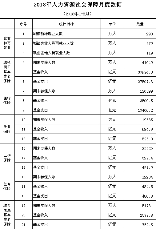 中新网客户端10月15日电(记者李金磊)人社部近期公布了2018年1-8月人力资源社会保障统计数据,前8月城镇职工基本养老保险、城乡居民基本养老保险、医疗保险、失业保险、工伤保险、生育保险等各项社保基金收入达48768.94亿元,支出为41136.28亿元。