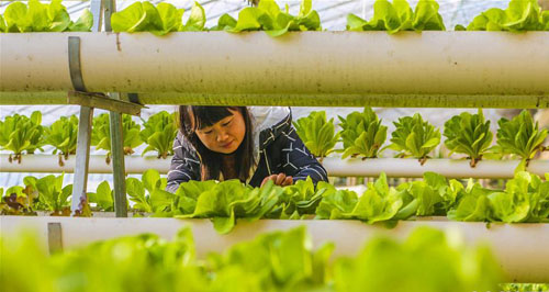 12月3日,工作人员在大厂回族自治县一家农业园打理无土栽培的蔬菜。