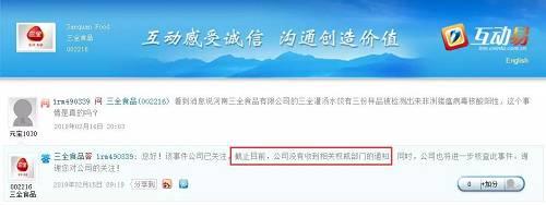 三全食品在公告中提到,河南省政府已经派出由省畜牧局牵头的联合调查组,分别奔赴湖南、甘肃两地,协同当地有关部门核查相关情况,公司也正积极配合相关政府部门的工作。