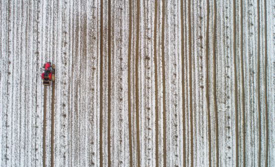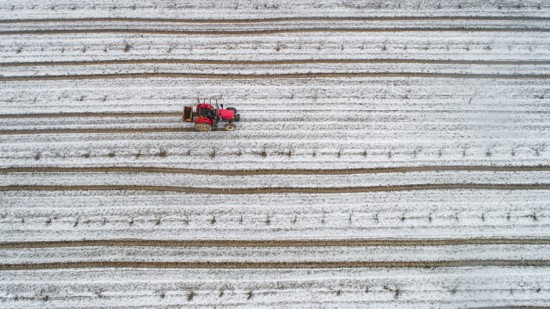 当日,在雪后的江苏泗洪金锁镇软籽石榴基地,拖拉机在银色的大地上绘出漂亮的线条。