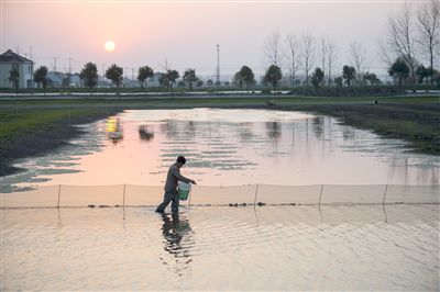 近年来,白甸镇官垛村利用水网密布的天然优势,大力发展螃蟹规模养殖,螃蟹养殖成为当地农民增收的特色产业。图为蟹农在给蟹苗喂饵料。(徐劲柏 姚兰)